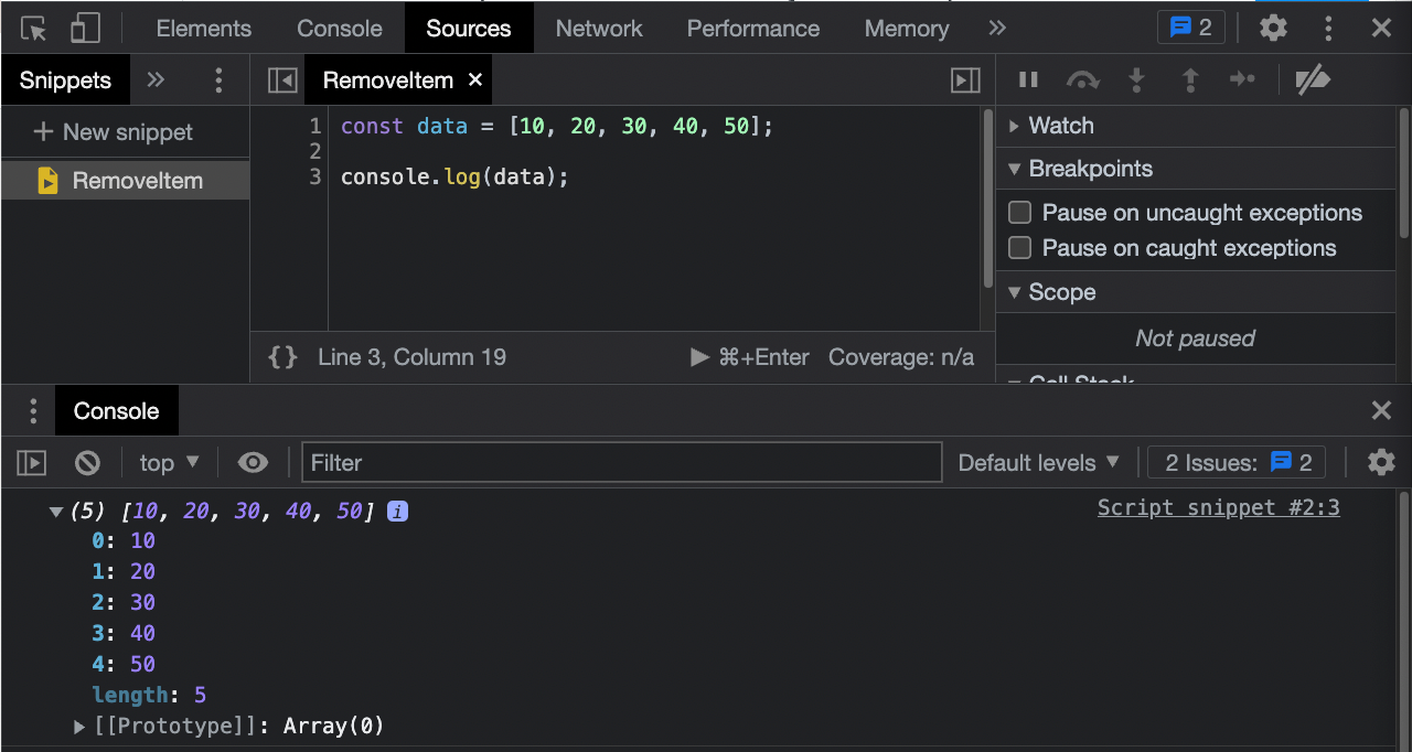 console.log(array); // [10, 20, 30, 40, 50]You can run this snippet directly on google chrome developer tools under the sources tab, create a snippet, and you are good to run JavaScript snippets directly on the browser.