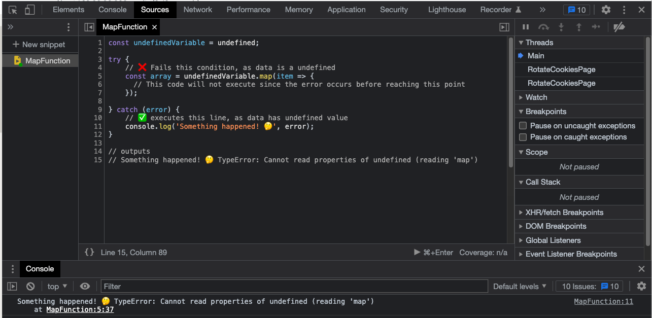 In the above code undefinedVariable is intentionally set to undefined. When you attempt to call the map function on this variable, it will result in the "TypeError: Cannot read property 'map' of undefined" error. This error occurs because undefined does not have a map method.